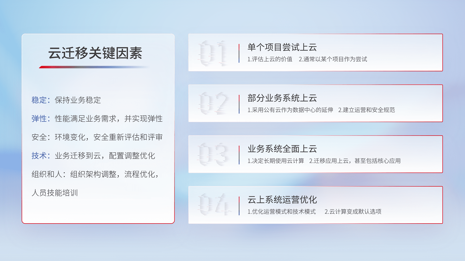 结合实际业务,,从规划设计、、、云平台选型、、、、云原生改造、、数据迁移、、集成交付,,,,迁移全过程为客户识别最佳上云路径,,做好风险识别管理,,设计网络架构、、、、身份权限、、安全审计合规、、、、操作审计、、、日志审计、、、监控告警策略、、、多站点容灾设计等,,对云上基础设施进行整体规划,,提升IT治理水平,,,以满足弹性、、高可用、、、高性能的需求。。。