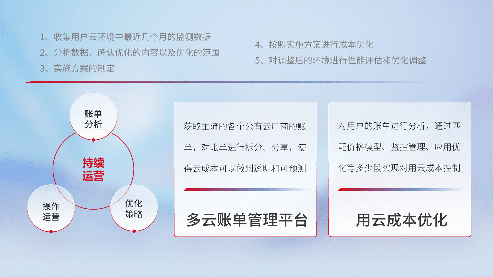 通过多云纳管,,,,以统一的资源数据模型把客户的云资源进行抽象和封装,,进而实现对多云资源的统一操作,,保障云资源管理的可靠性、、、稳定性与可用性。。。量身定制化运维内容,,,配置、、、开发运维、、补丁管理、、备份、、、、监控、、认证和访问管理、、、、审计和日常巡检等,,,,保障在用云过程中的可靠度,,稳定度以及高可用率。。。